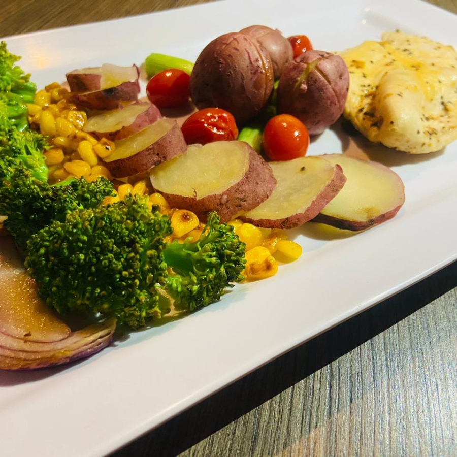 Pechuga de Pollo (150gr) sal pimentada y aderezada con limón, acompañada de brócoli, cebolla morada elote, jitomate Cherry, ejote papas cambra