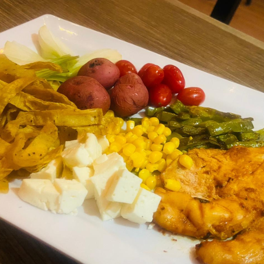 Pechuga de Pollo (150gr) Salpimentada y en salsa de chipotle acompañada de nopal picado en rajas, jitomate Cherry, cebollines, elote, papas cambray, tortilla chip, aceite de oliva y queso panela en cubos