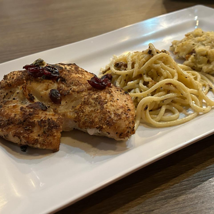 Pechuga de Pollo (150gr) a la plancha sazonada con sal pimienta, rellena de arándanos secos, queso doble crema espinacas aceite de oliva, romero, tomillo y miel de abeja, acompañados de Pasta a la crema y puré de papa