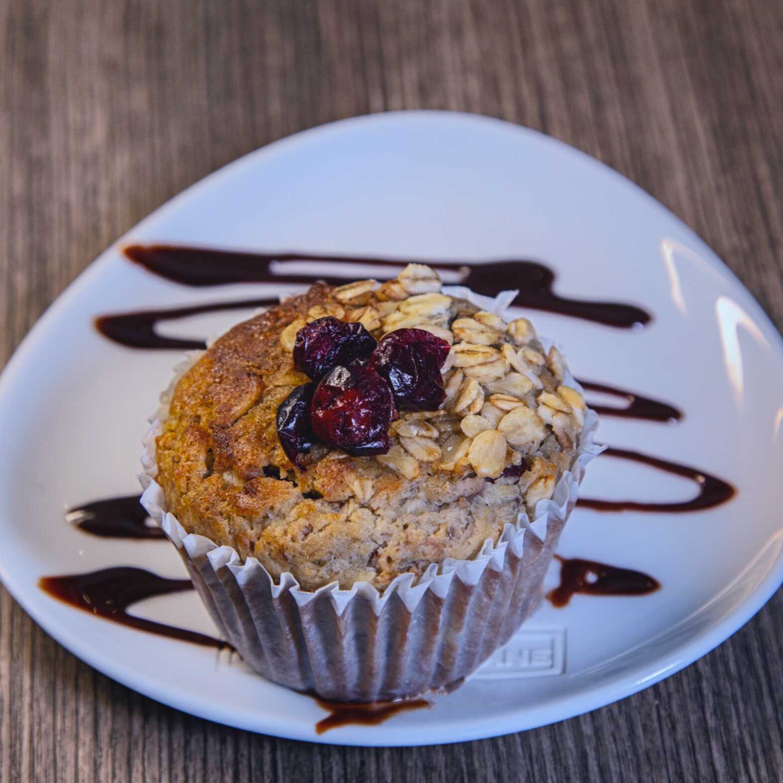 Delicioso muffin de plátano, elaborado a base de fruta natural con avena, arandano y chia, libre de gluten y harinas. Un antojo saludablemente delicioso.
