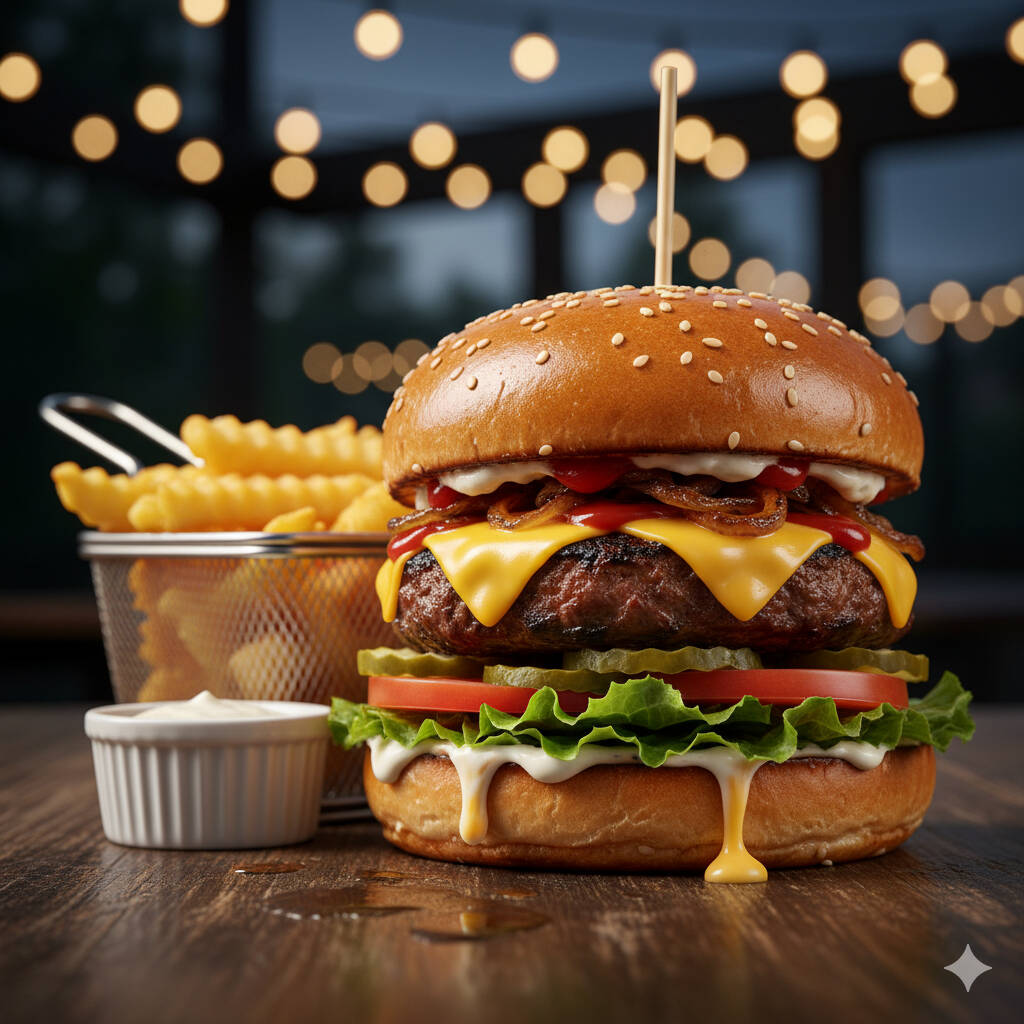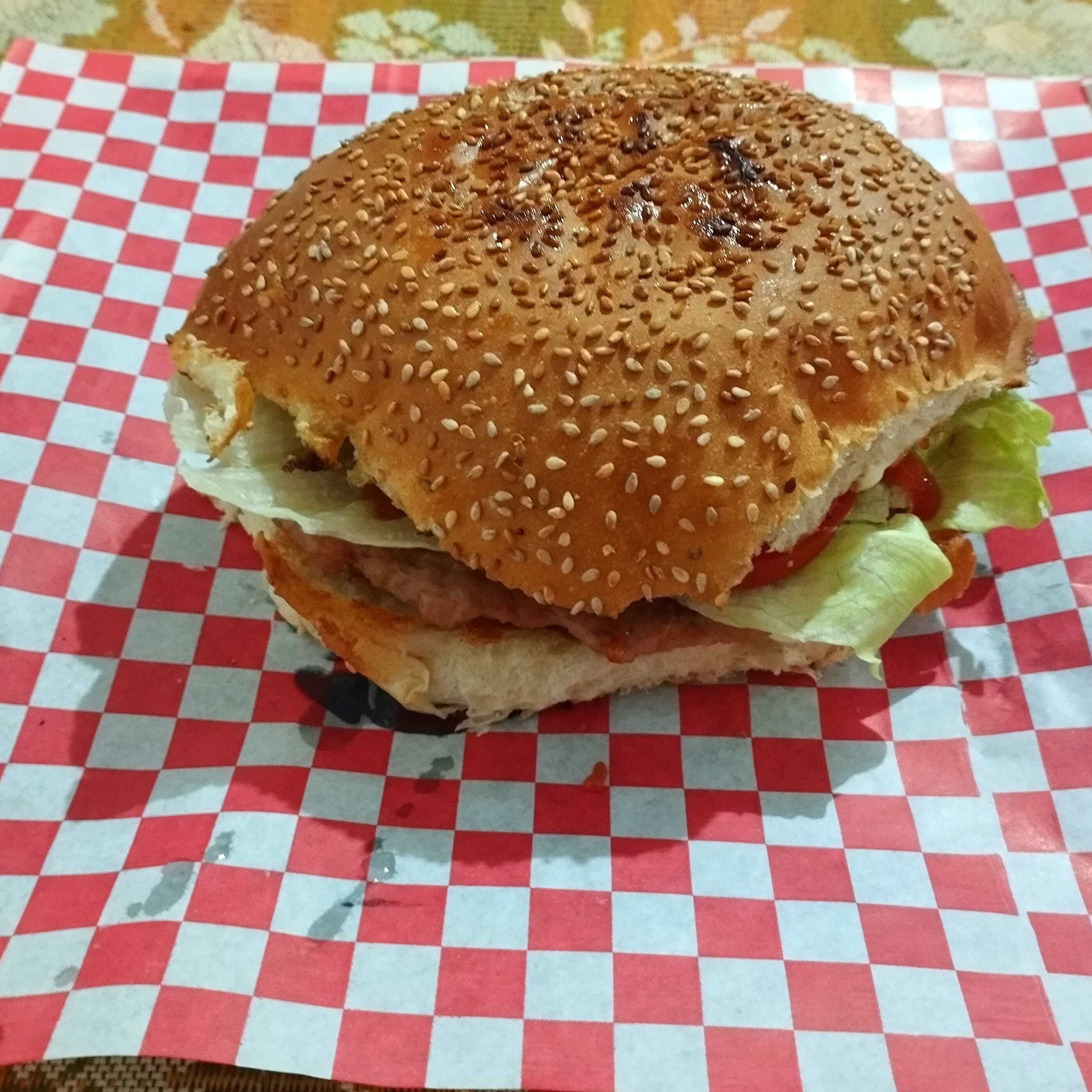Pan grande , carne, queso amarillo, verduras, capsup, mayonesas