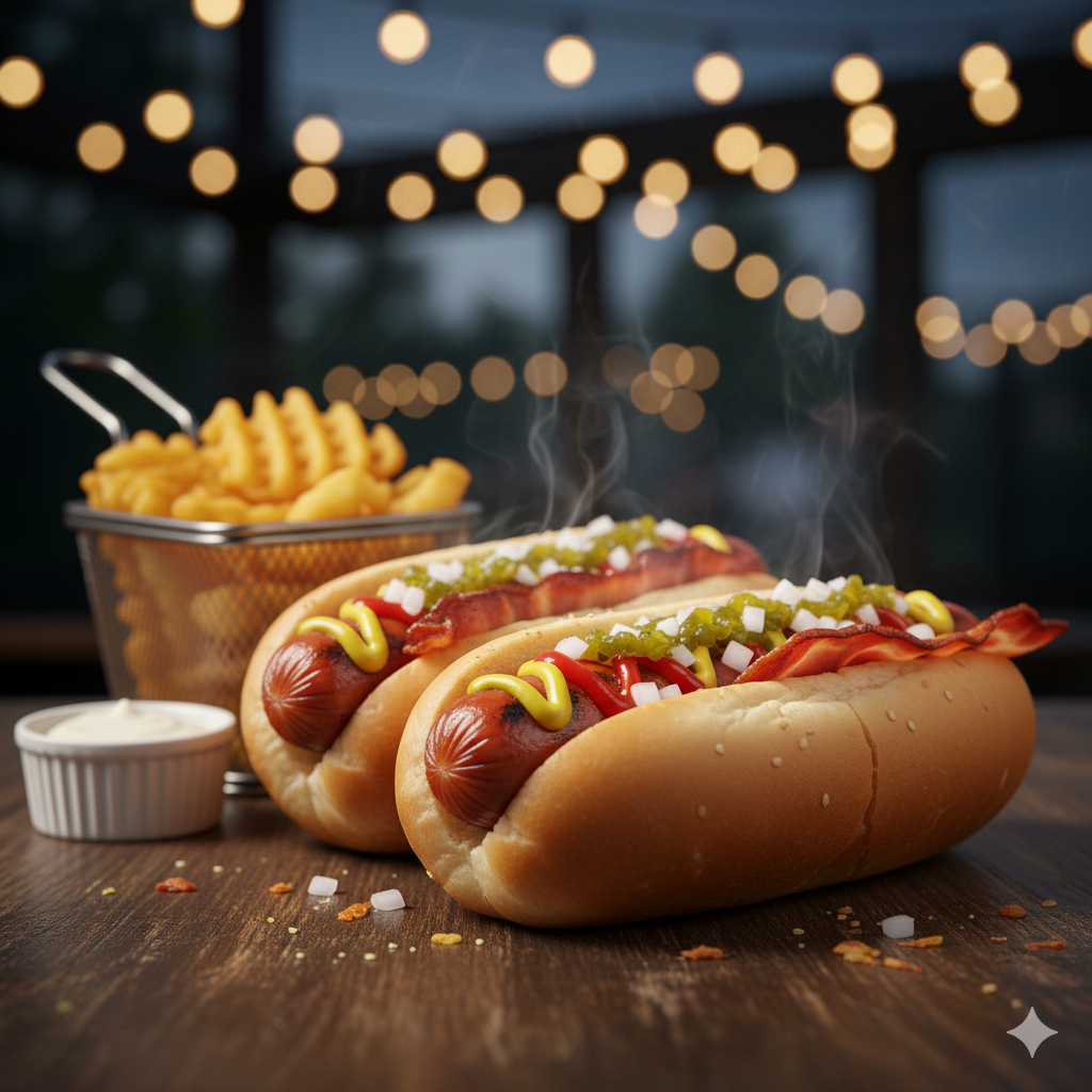 Pan, salchicha de calidad, tocino, jamón, queso asadero, verduras, capsup y mostaza