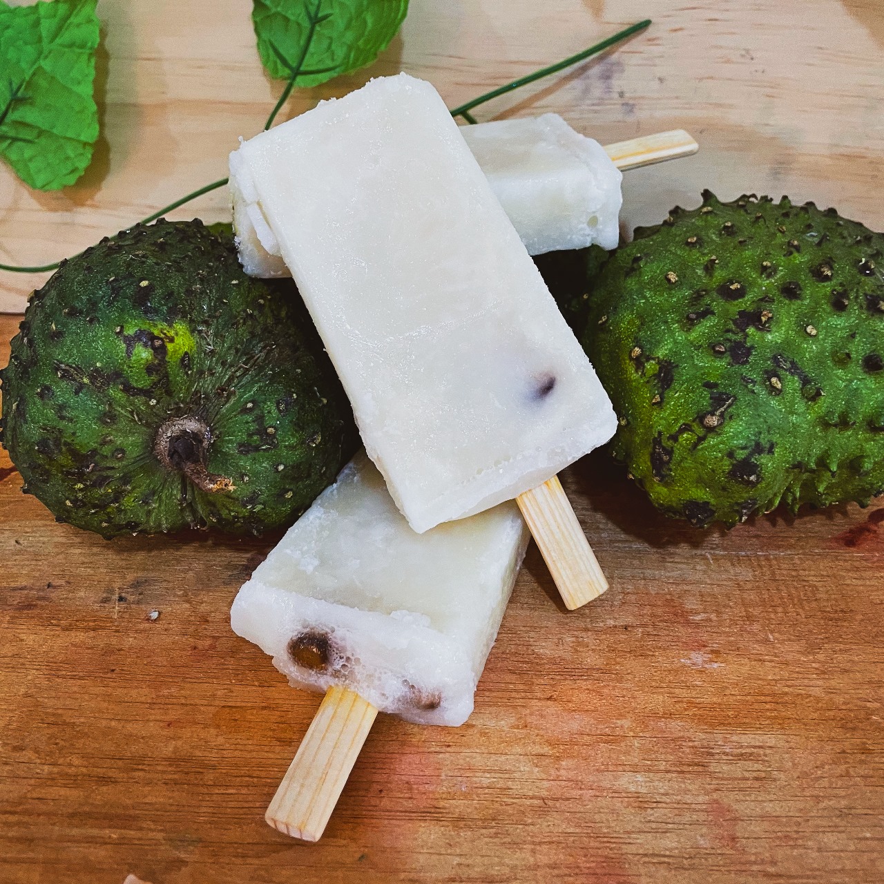 Paleta de hielo con base de agua y trocitos de Guanábana.