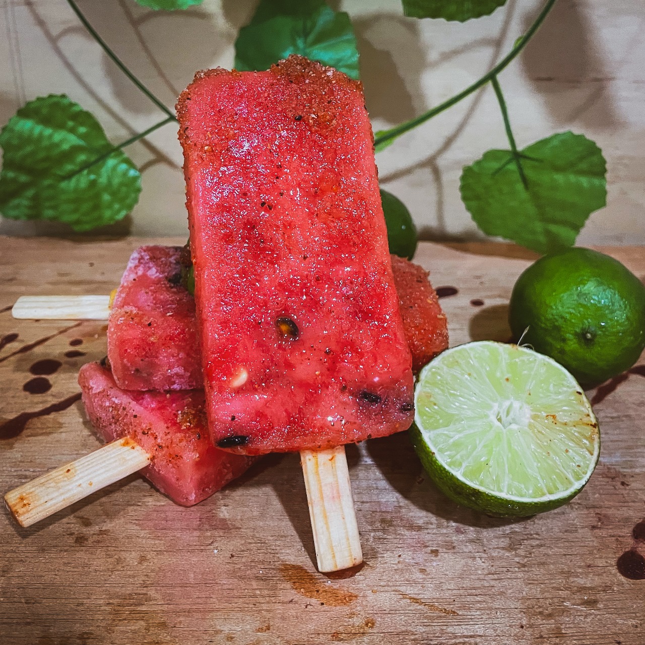 Paleta helada de agua gourmet, base de sandía con jugo de limón y chile en polvo espolvoreado sobre toda la paleta.