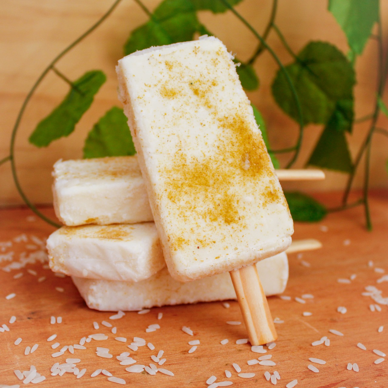 Paleta de hielo con base de crema, de arroz con leche, con canela espolvoreada.