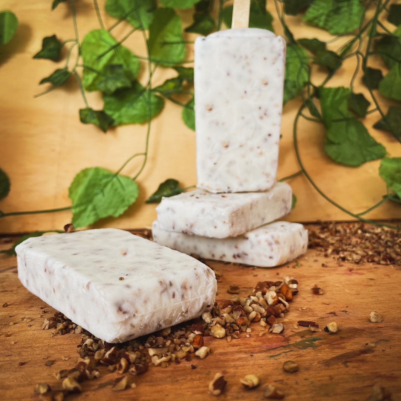 Paleta de hielo con base de crema con trocitos de nuez variada.