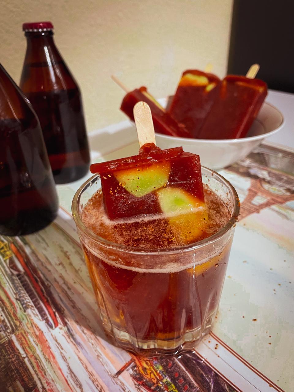 Paleta estilo preparado de clamato con salsa inglesa, salsa de soya y salsa maggie. Con una aceituna por dentro. combínalo con tu cerveza favorita.