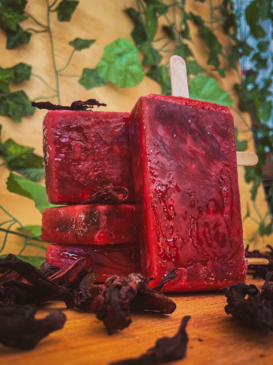 Paleta de hielo con base de agua con trocitos de Jamaica natural.