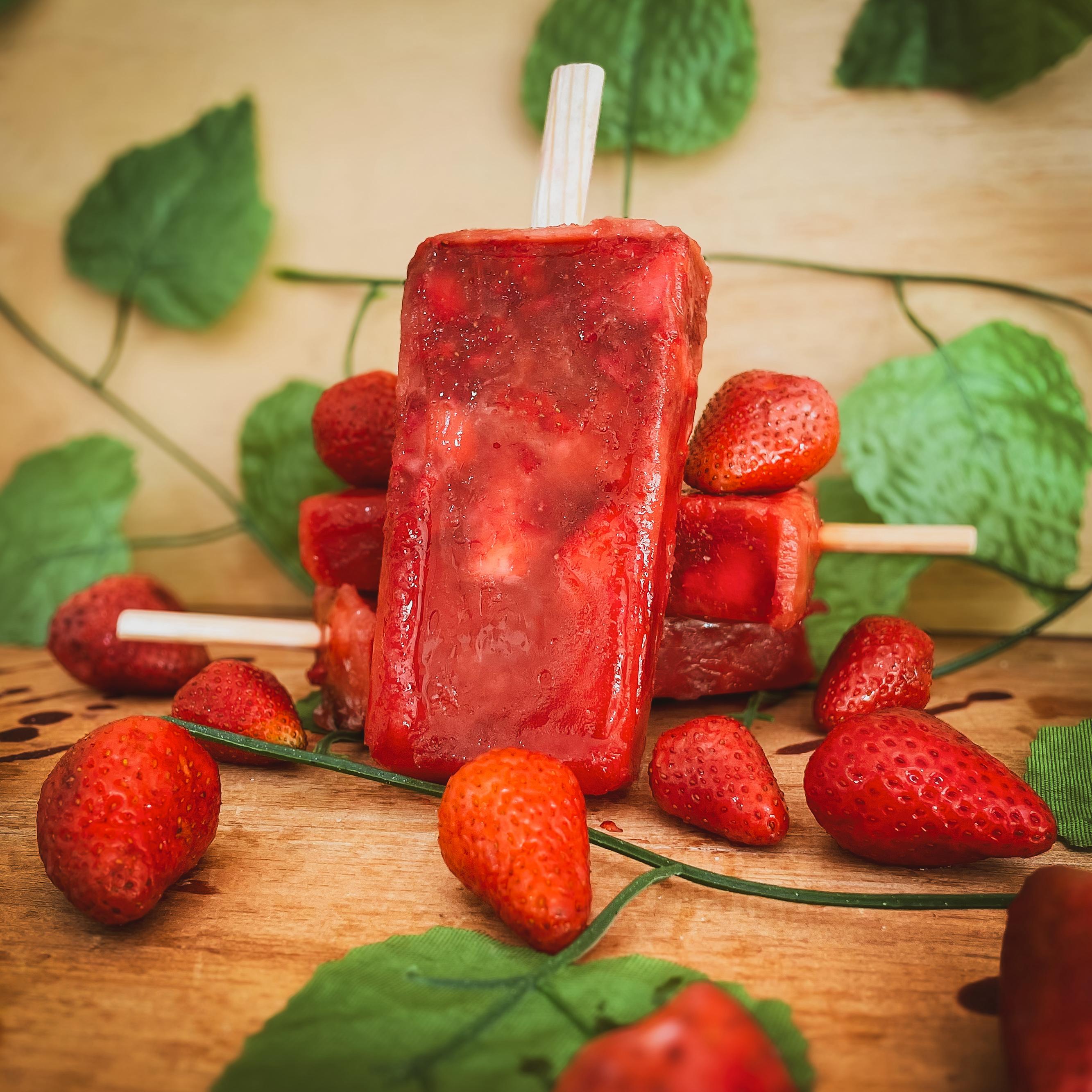Paleta de hielo con base de agua con trocitos de fresa natural.