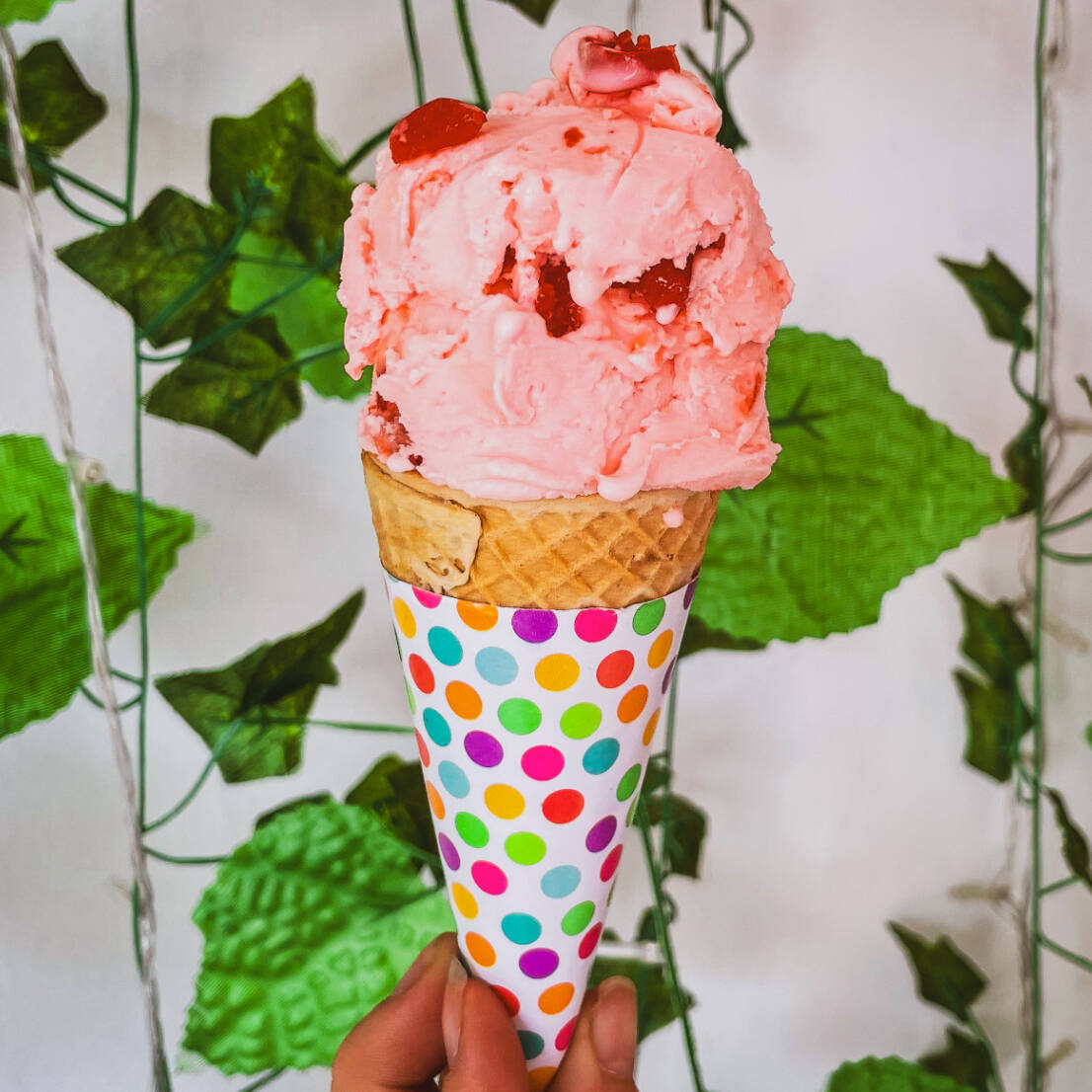 Helado sabor cereza con trocitos de cereza, servido en vaso con 2 bolitas de nieve