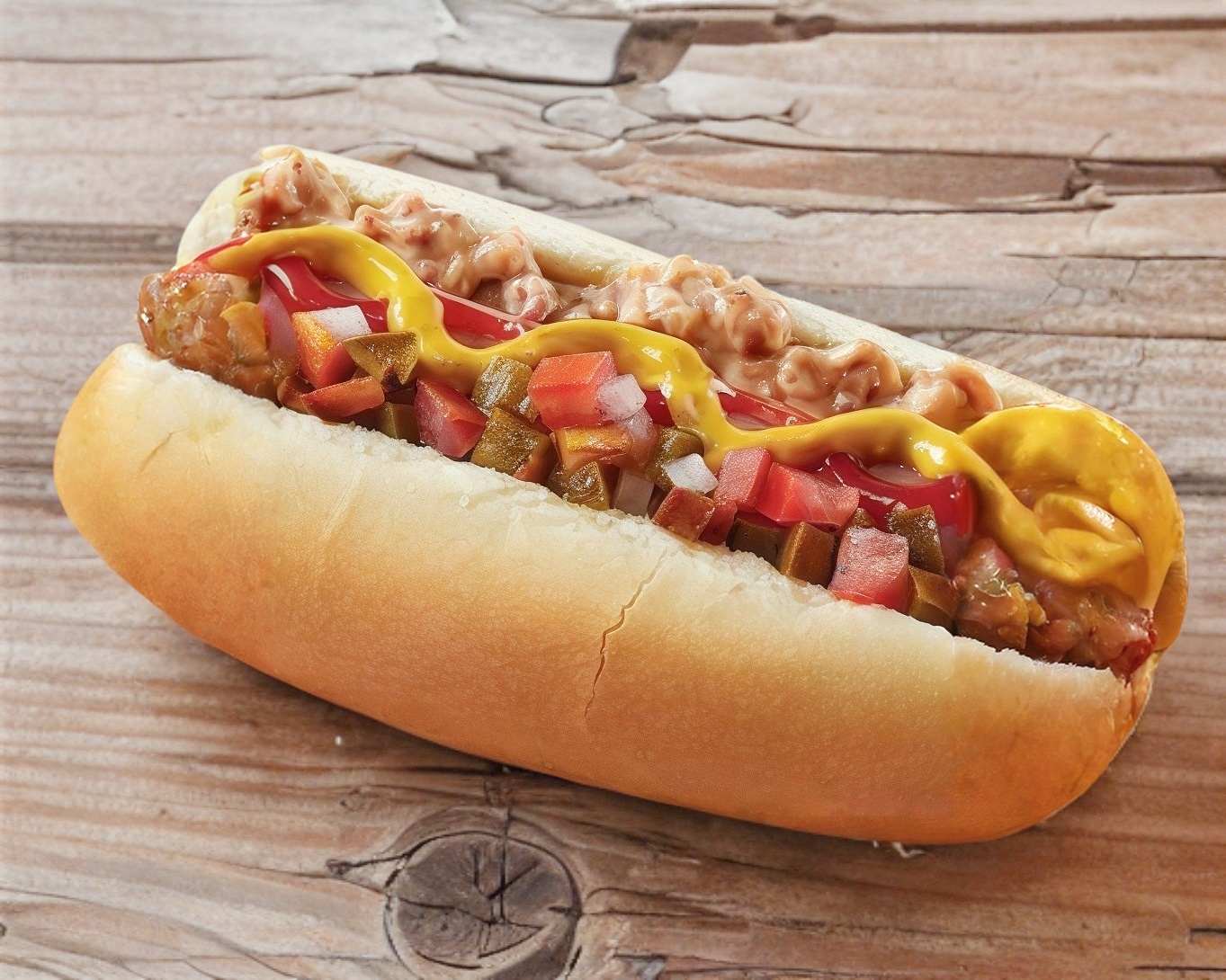Salchicha de pavo, tomate, cebolla, cátsup, mostaza y chile.