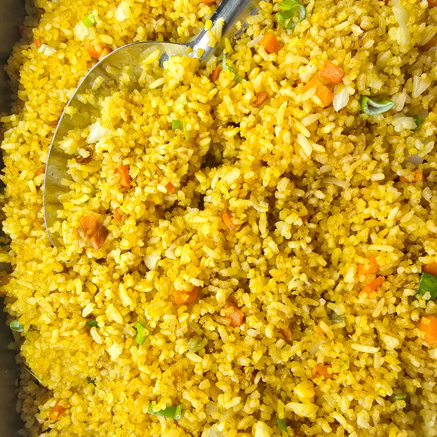 Arroz salteado al wok con vegetales, huevo y un toque de soya.