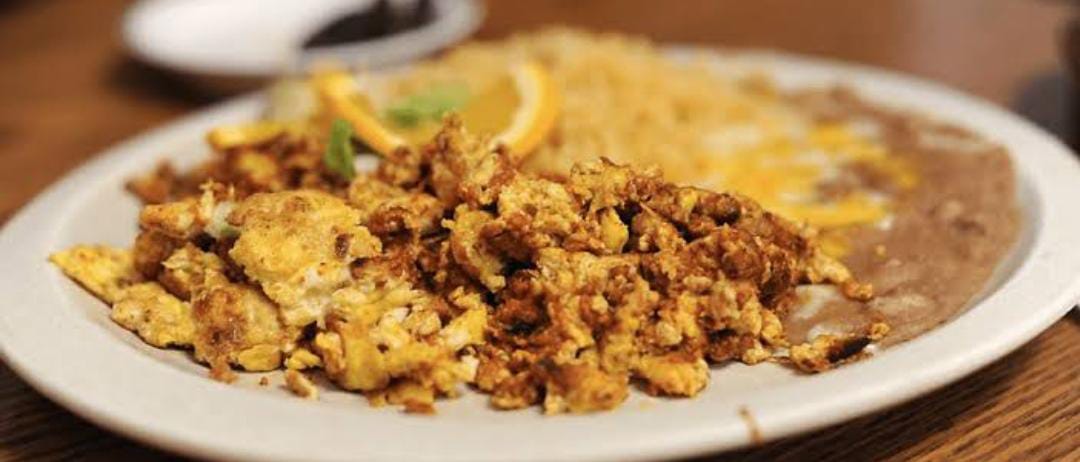 Deliciosa carne machaca con huevos revueltos acompañada de frijoles y bolillo