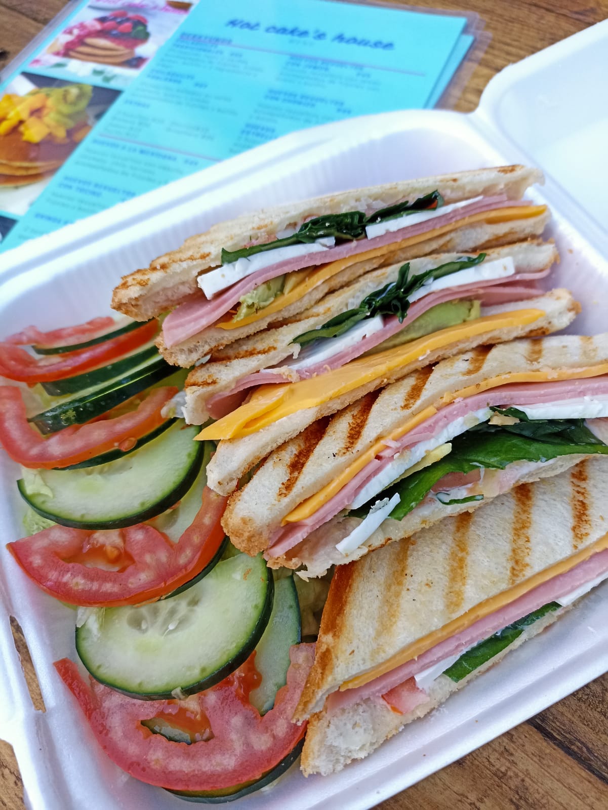Sandwich doble de jamón con queso amarillo queso panela mayonesa espinaca jitomate aguacate acompañado de ensalada de lechuga y pepino.