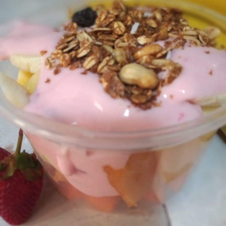 Vaso de medio litro con papaya,plátano, manzana, yogurt de fresa y granola.