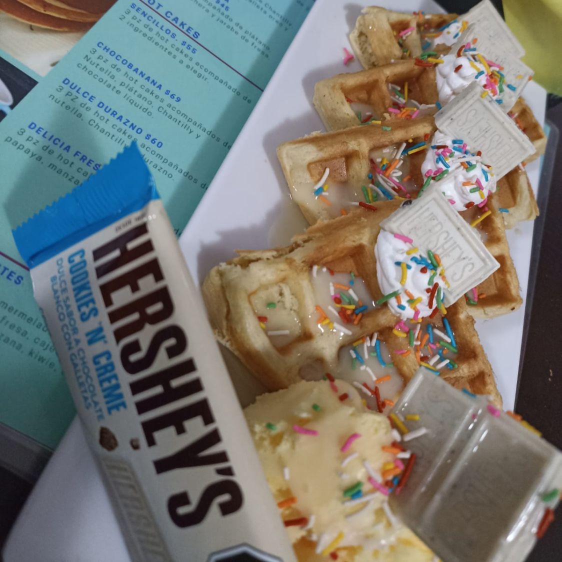 Delicioso waffle acompañado de lechera crema batida helado de vainilla chispas de colores un delicioso chocolate hershey's cookies and cream y un toque de sabor mágico.