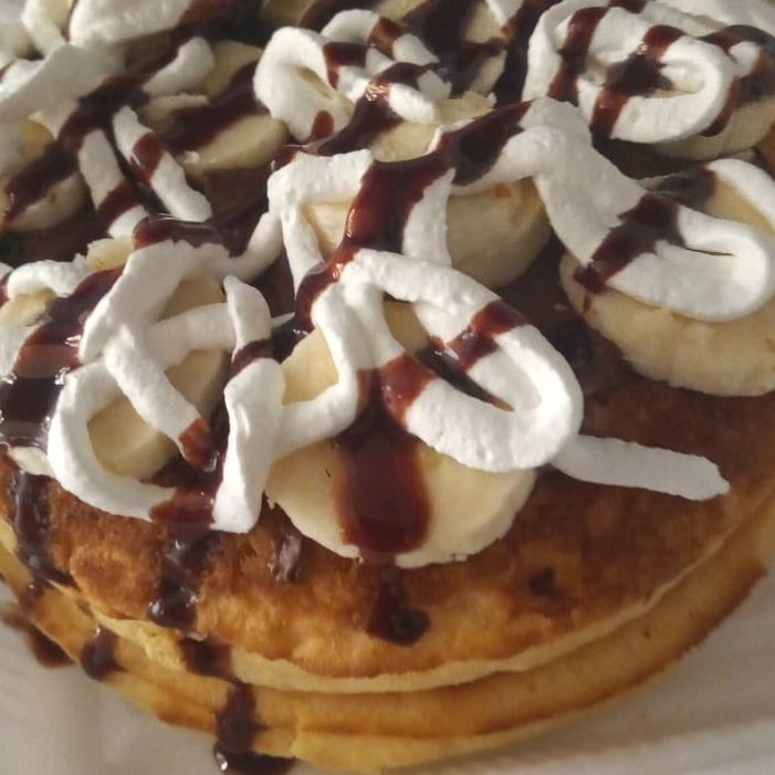 dos piezas de deliciosos hot cakes, con nutella, lechera, almendra fileteada, y chocolate ferrero.