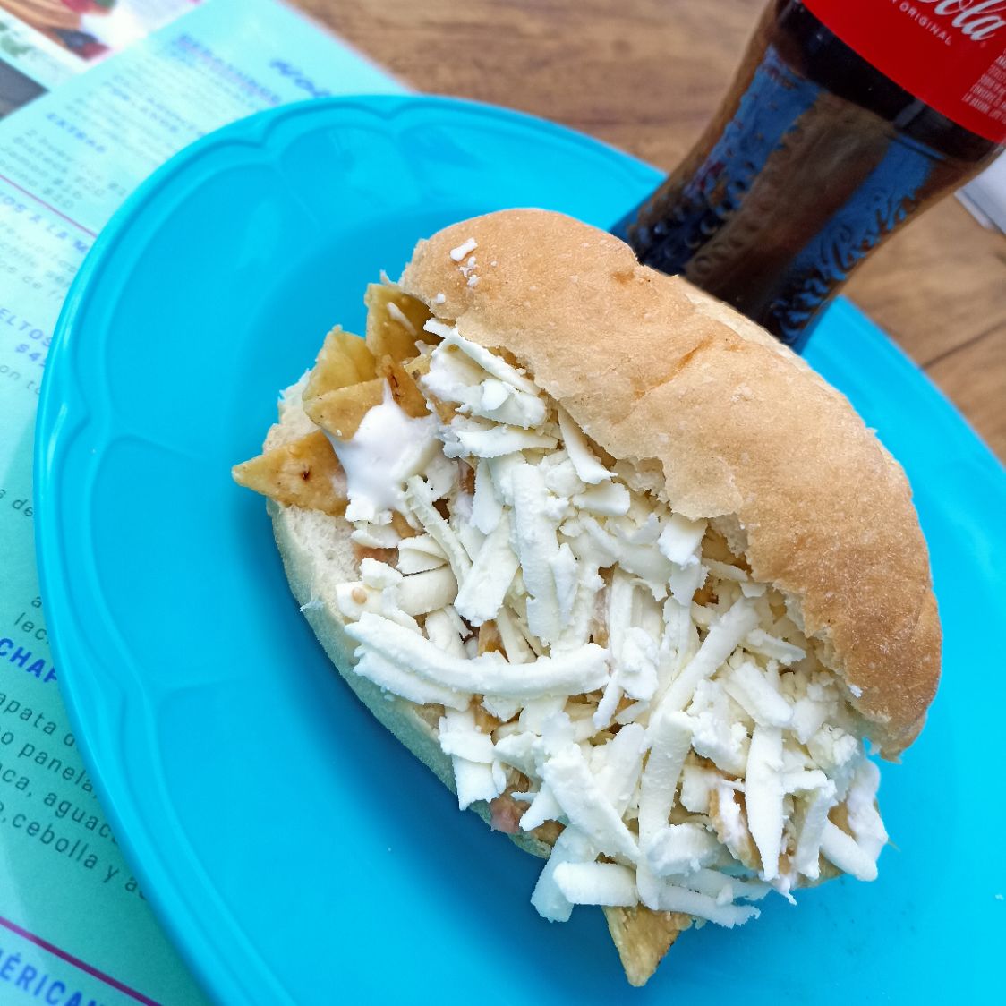 Chapata con mayonesa, queso panela, queso chedar, queso manchego, jamón, espinaca, jitomate, cebolla, aguacate, y acompañado de aderezo ranch.