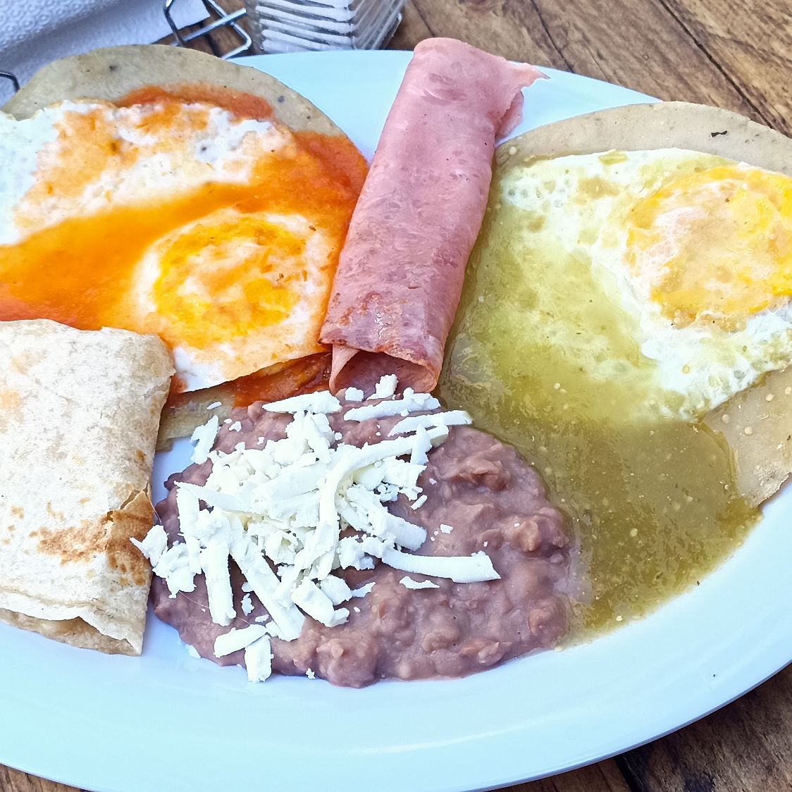 Dos huevos estrellados sobre tortilla frita uno bañado en salsa verde otro bañado en salsa roja acompañadas de rebanada de jamón quesadilla de harina frijoles queso y bolillo.