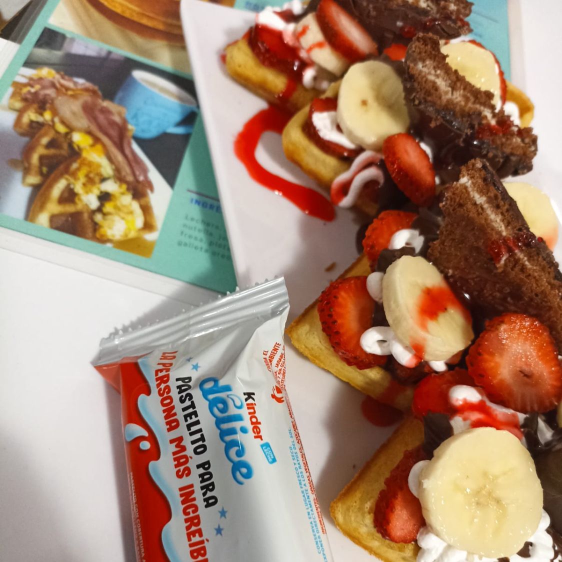 Delicioso waffle acompañado de crema batida chocolate líquido fresa plátano y un delicioso kinder delice.