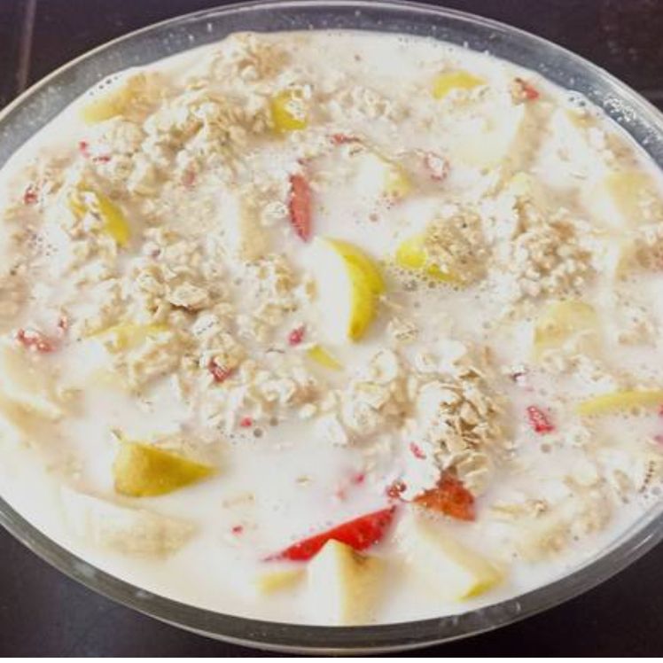 Delicioso plato de avena acompañada de manzana, fresa, plátano y leche