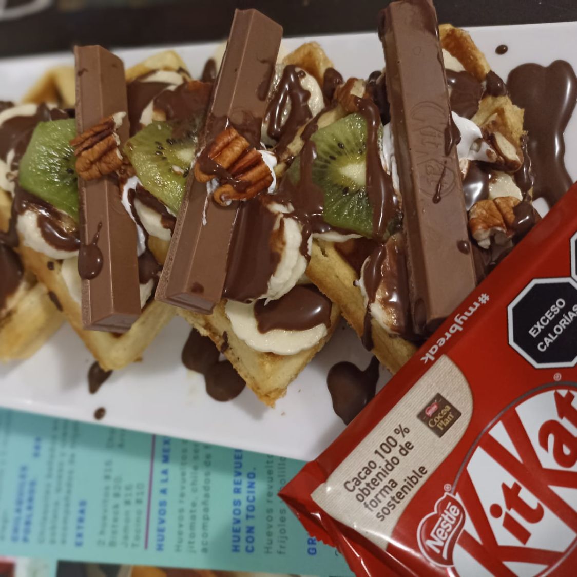 Delicioso waffle acompañado de plátano kiwi nuez lechera chocolate líquido y un delicioso chocolate kit kat.