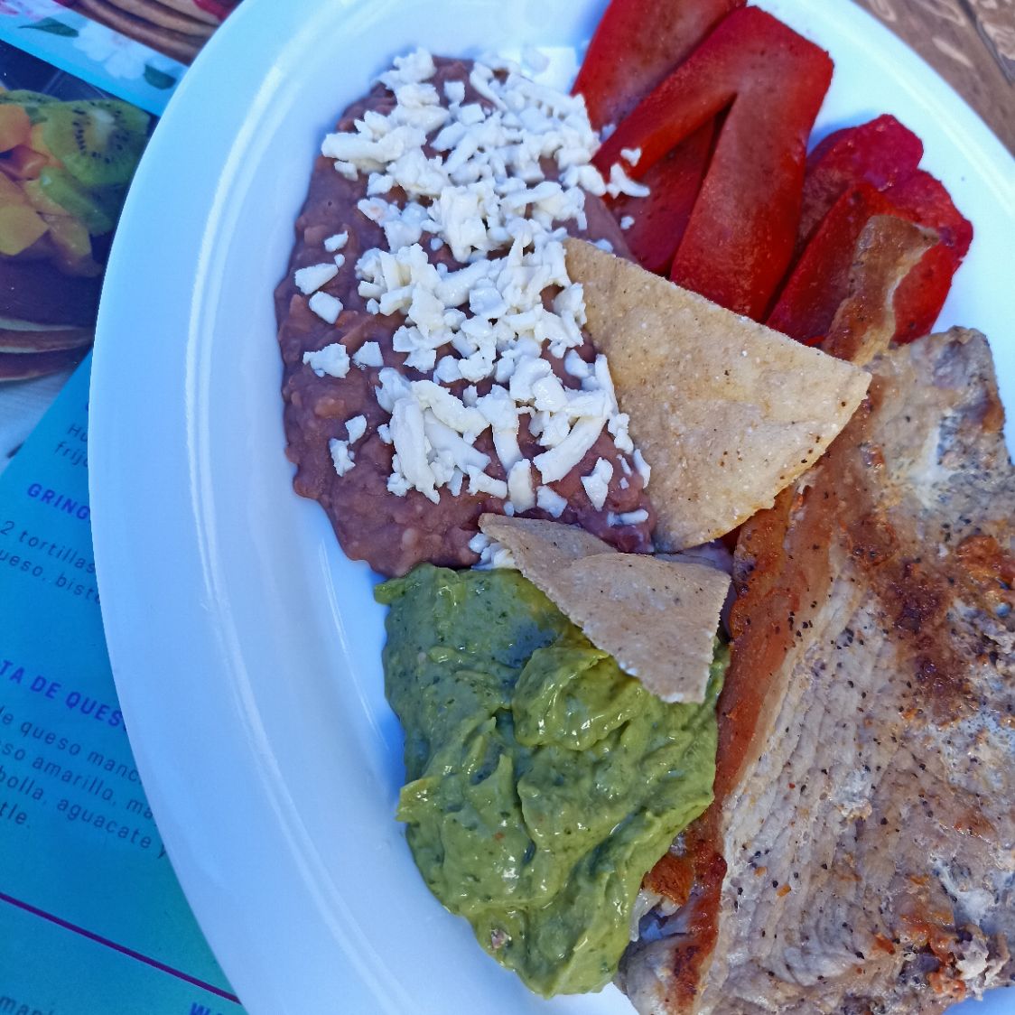 Deliciosa arrachera acompañada de salchicha asada frijoles aguacate, una quesadilla de harina y totopos.