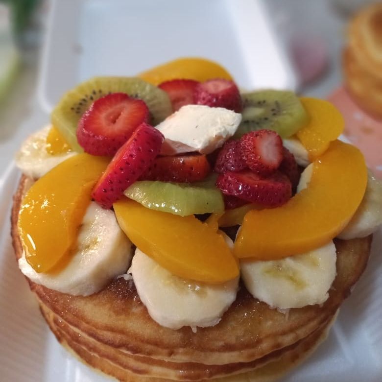 tres piezas de deliciosos y esponjosos hopt cakes bañados en tres leches, acompañados de platano, fresa, durazno, kiwi y lechera