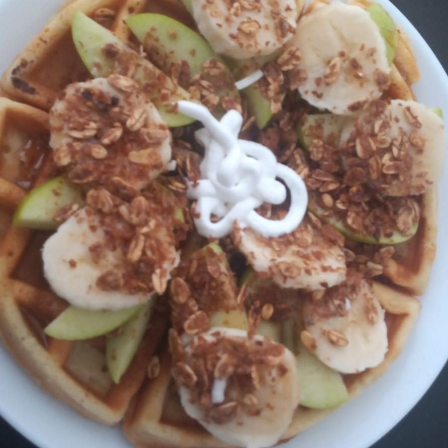 Delicioso waffle acompañado de manzana lechera nuez y canela.