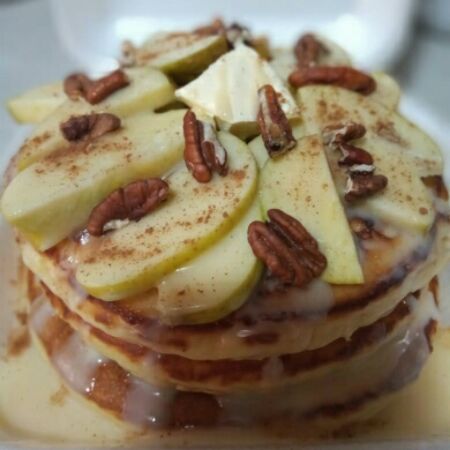 Tres deliciosos hot cakes acompañados de lechera, manzana, canela y nuez.