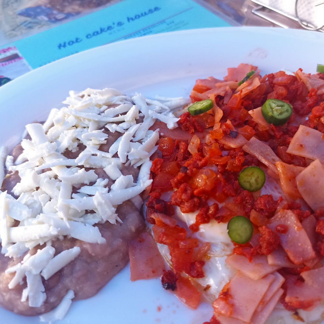 Huevos estrellados bañados con pico de gallo chorizo y jamón acompañados de frijoles y bolillo