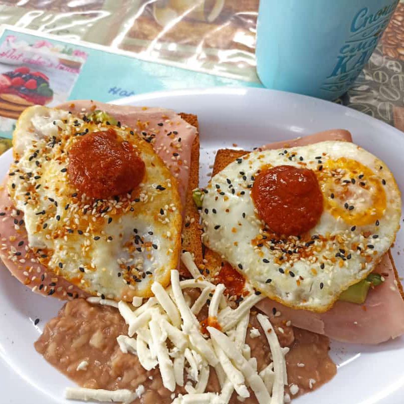 Dos panes tostados, con una cama de jamón con aguacate, huevos estrellados y especies de la casa, acompañados de frijoles