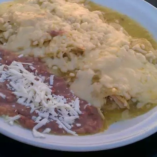 5 enchiladas rellenas de pollo bañadas en salsa roja o verde, gratinadas con queso acompañadas frijoles