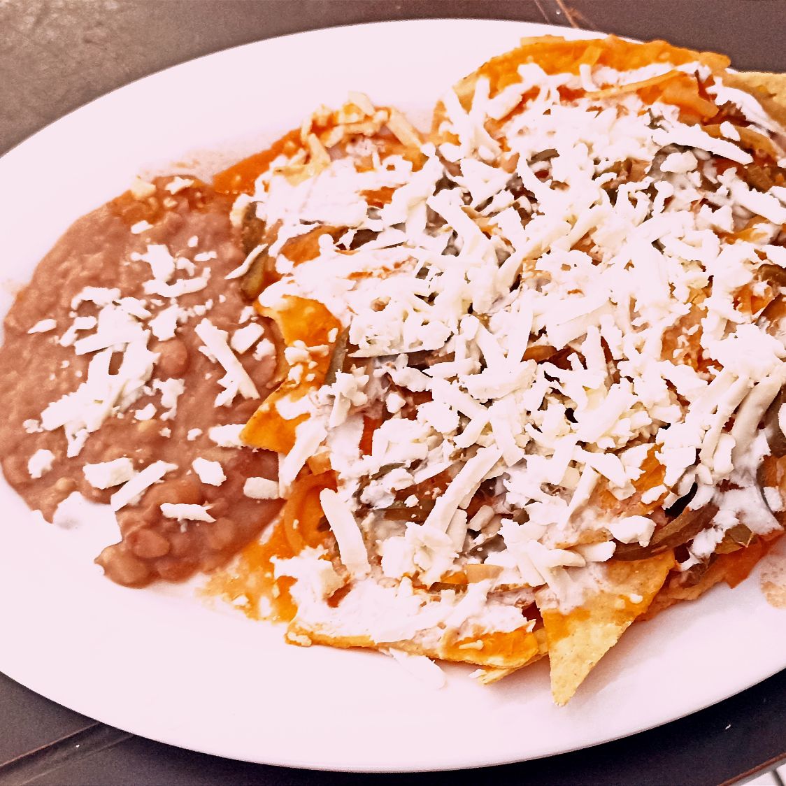 Chilaquiles bañados en salsa verde o roja acompañados de frijoles queso crema y bolillo.