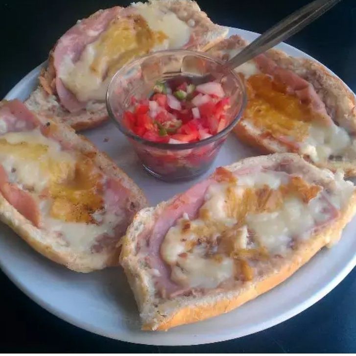 4 piezas de molletes de frijoles, jamón, gratinados con queso mozzarella, acompañados de pico de gallo y salsita picante