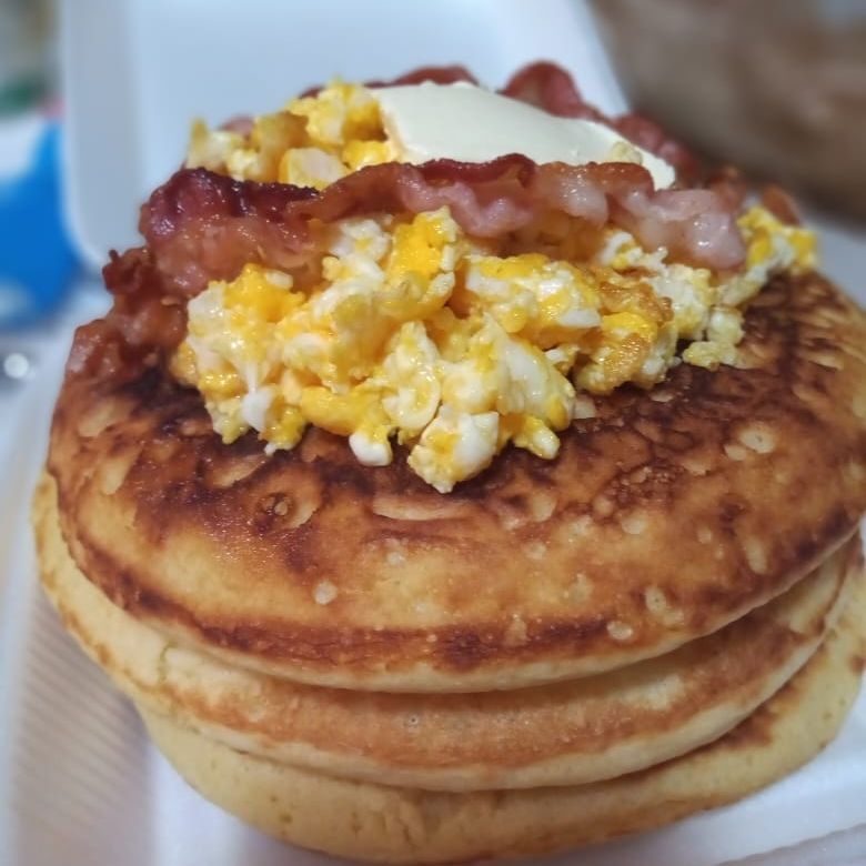 Tres deliciosos hot cakes acompañados de 2 huevos revueltos con tiras de tocino y maple.