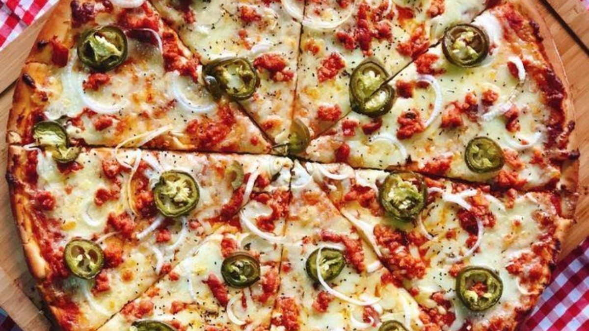 Pizza de 14 pulgadas, preparada con salsa de tomate, salsa de tomate, jamón, salchicha, jalapeño, chorizo, cebolla y queso mozzarella