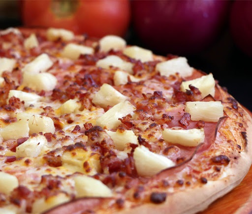8 porciones de pizza de 14 pulgadas, preparada con salsa de tomate, jamón, piña y queso mozzarella