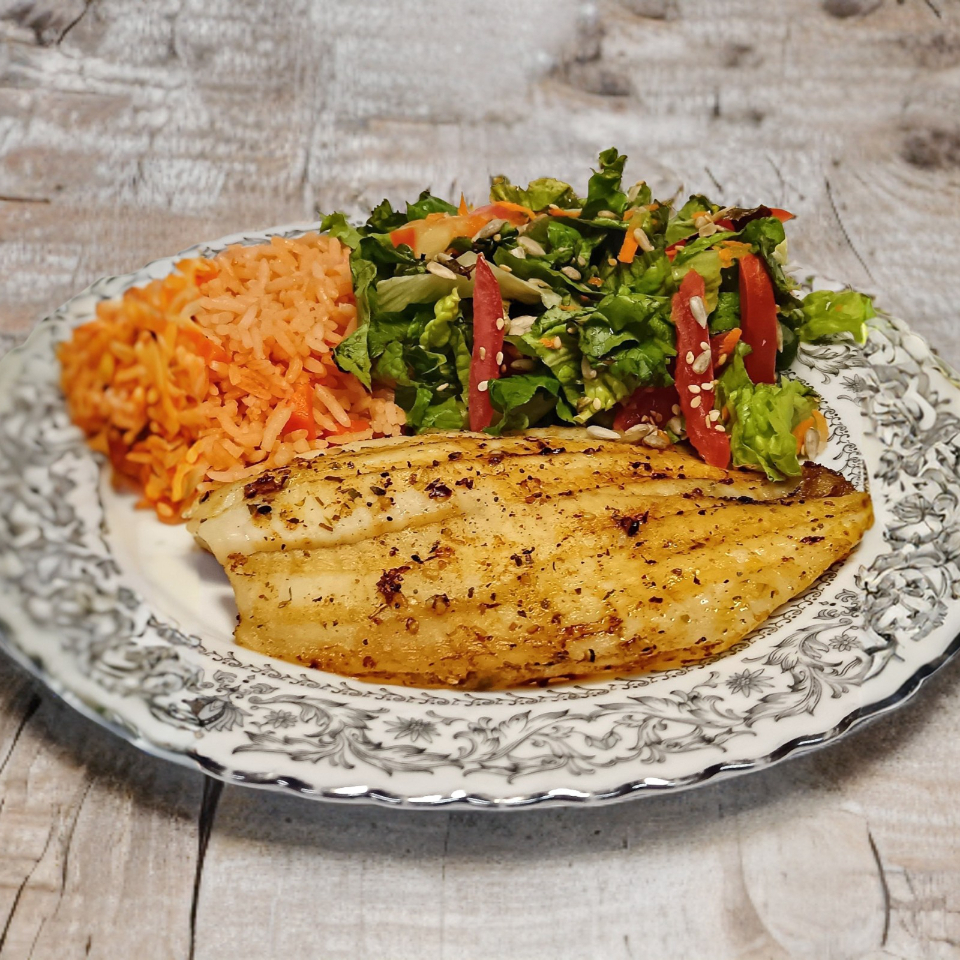 Filete de pescado tilapia sin espinas, asado a la plancha, acompañado con sopa de arroz del día y lechuga fresca
