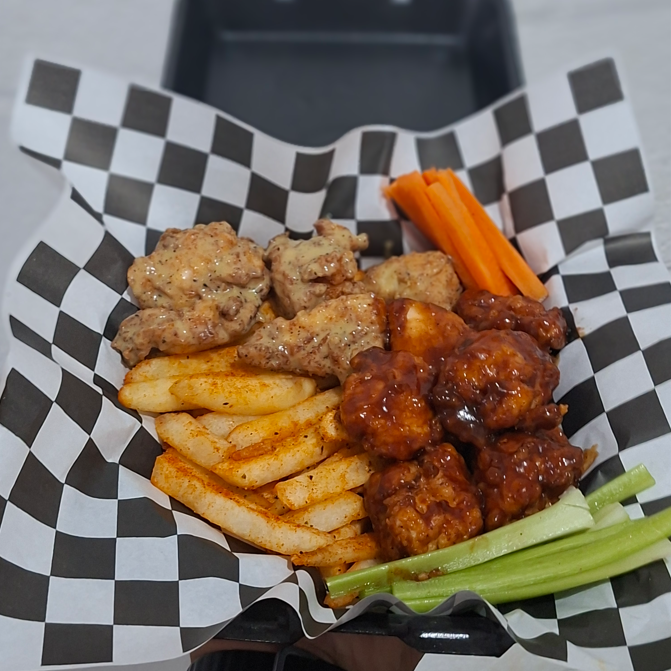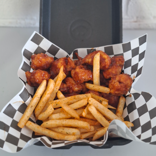 ¡El balance perfecto! Una porción de nuestros boneless súper crujientes bañados en tu salsa favorita, acompañados de papas a la francesa doraditas. Elige tu dip y disfruta de la mejor combinación en un solo paquete.