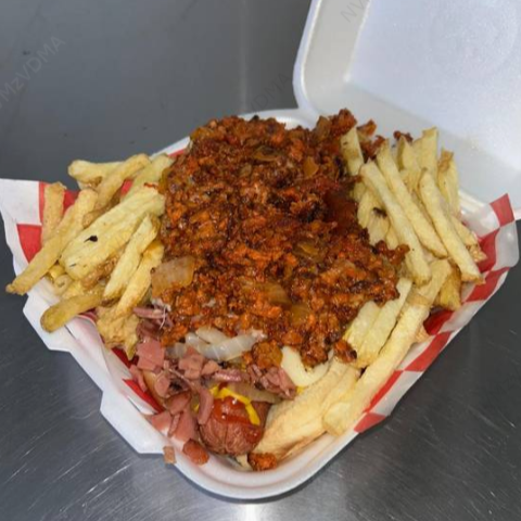 Pan y salchicha de 20 cm, acompañado con mayonesa, cátsup, mostaza y BBQ, cebollita asada, jamón, queso asadero y tocino ahumado. (Incluye papas a la francesa).