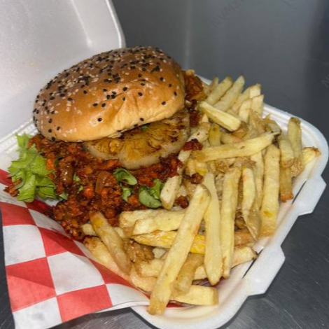 Pan, carne arrachera de res, acompañado con mayonesa, mostaza, cátsup, ranch, cebolla asada, jamón, queso americano, queso asadero, lechuga fresca, carne al pastor y piña (incluye papas a la francesa).