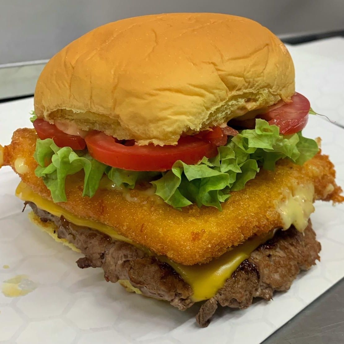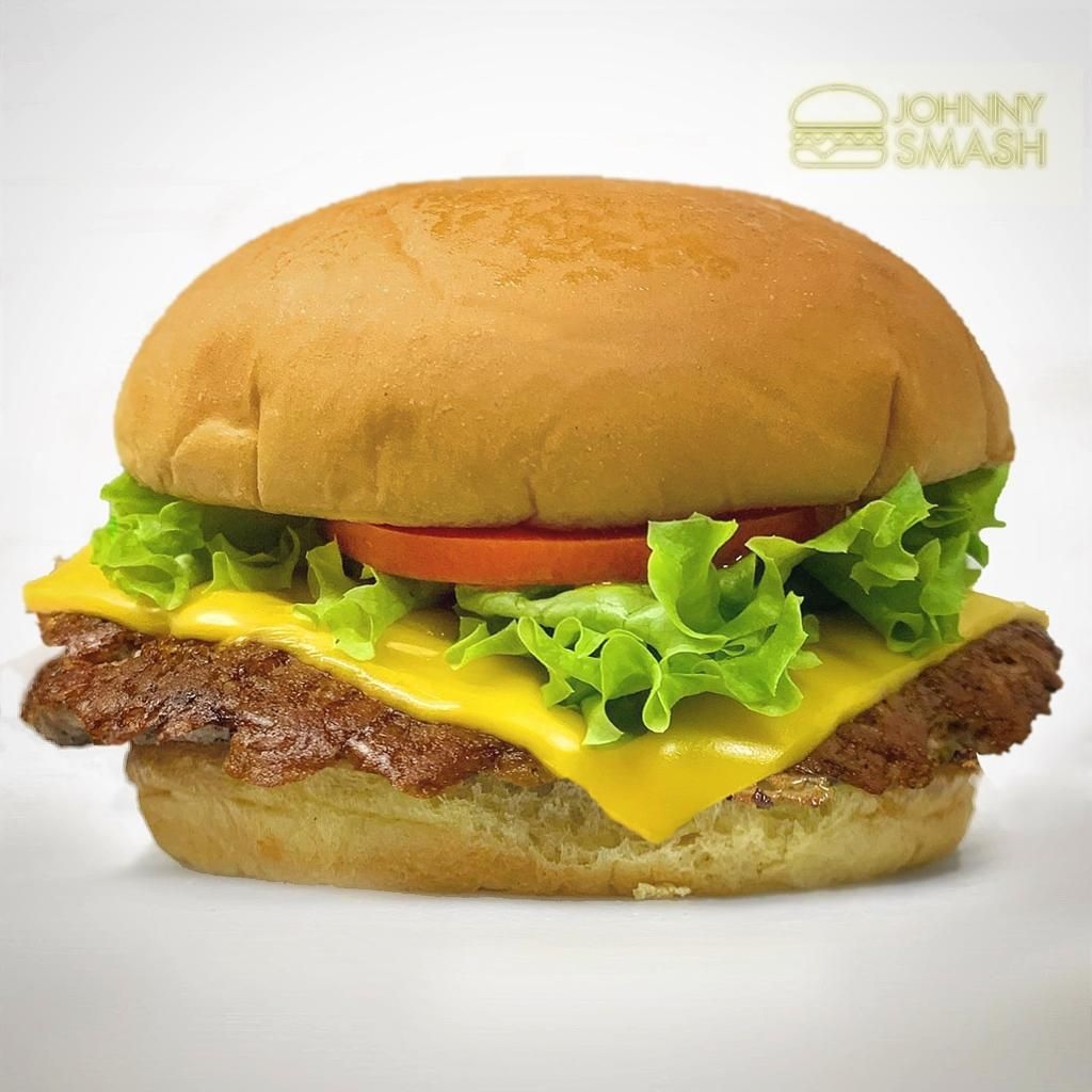 Bollo de papa, carne 100% de res, queso americano, lechuga, jitomate y aderezo.