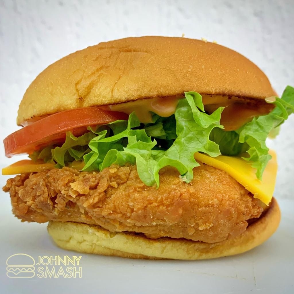 Bollo de papa, pechuga de pollo frita, queso, lechuga, jitomate y aderezo.