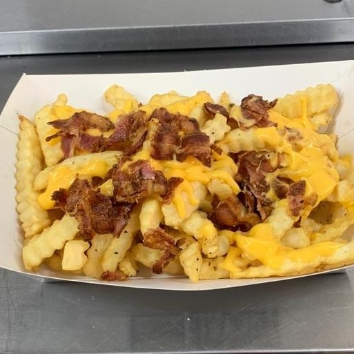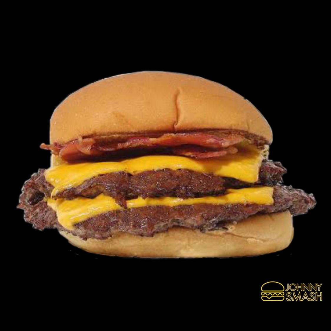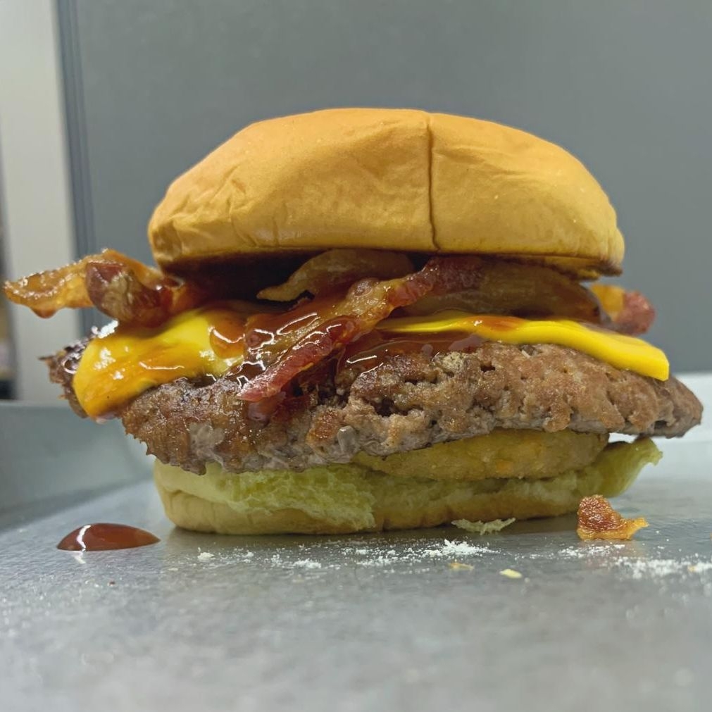 Bollo de papa, 100% carne de res, queso americano, tocino, aros de cebolla y salsa BBQ.