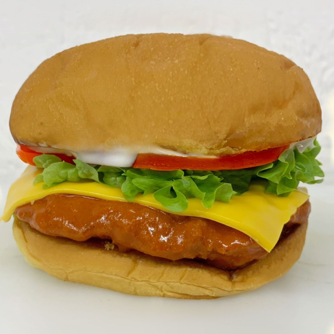 Bollo de papa, pechuga de pollo frita bañada en salsa búfalo, queso, lechuga, jitomate y aderezo Ranch
