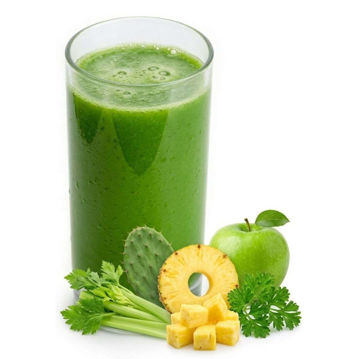 Jugo de naranja, agua, piña, nopal, apio, perejil, espinaca, acelga.