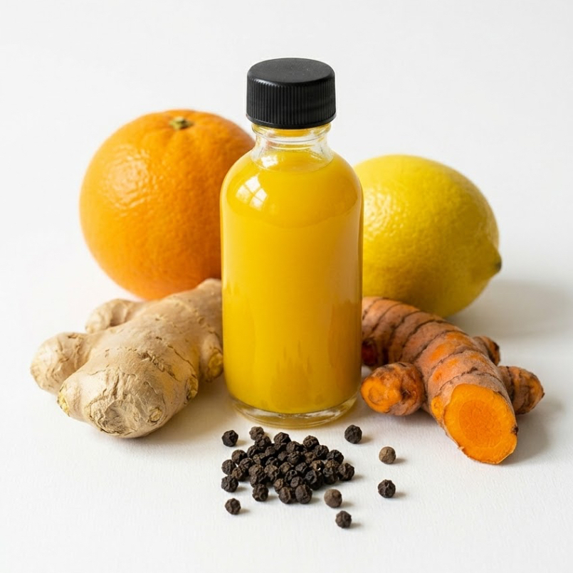 Extracto de naranja, limón con cúrcuma, jengibre y una pizca de pimienta.