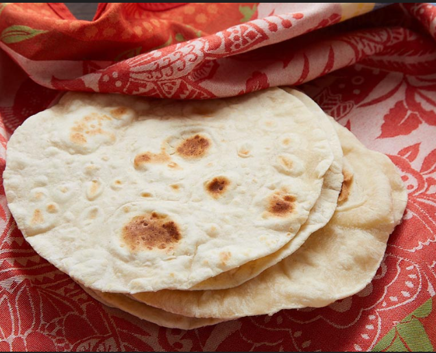 Taco de harina de lomo estilo rioverde, acompañados de tomate, cebolla, repollo, crema y salsa al gusto