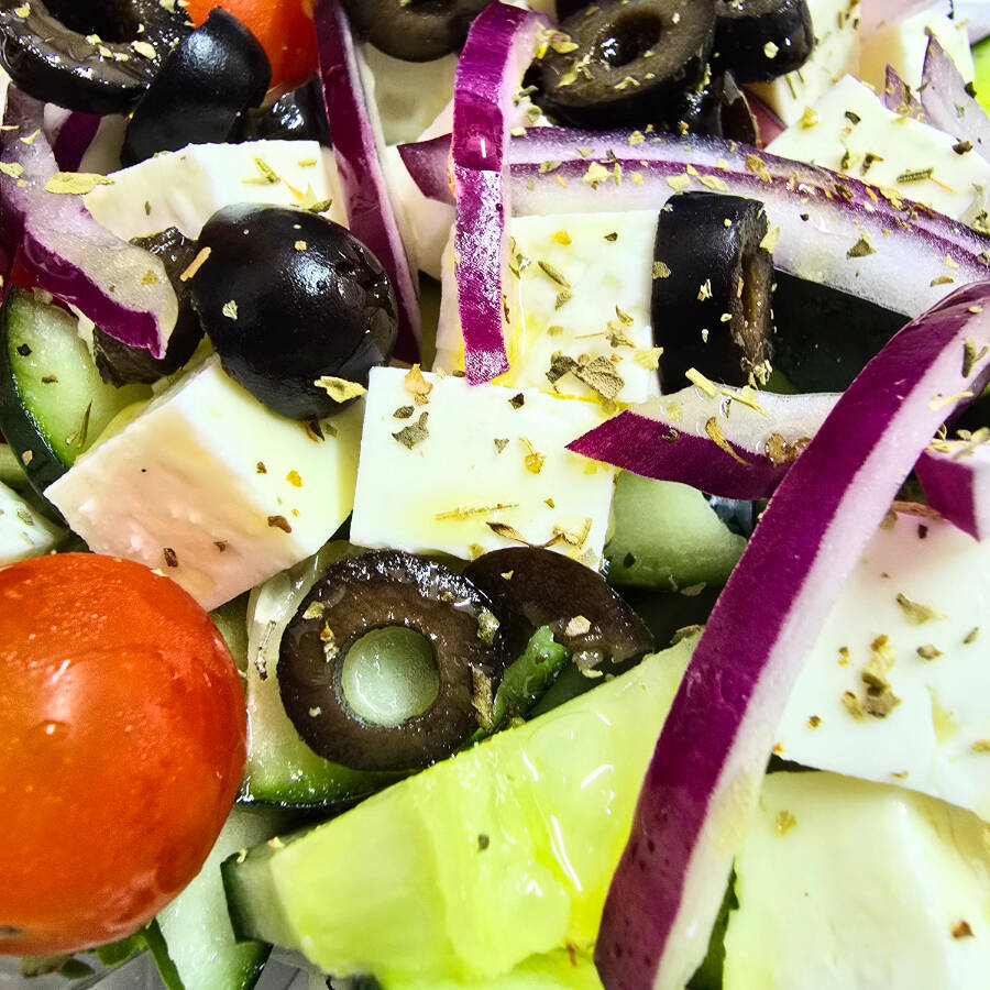 Ensalada con base de lechuga y pepino, acompañada con queso panela, tomate cherry, cebolla morada, hierbas finas y aceite de oliva.